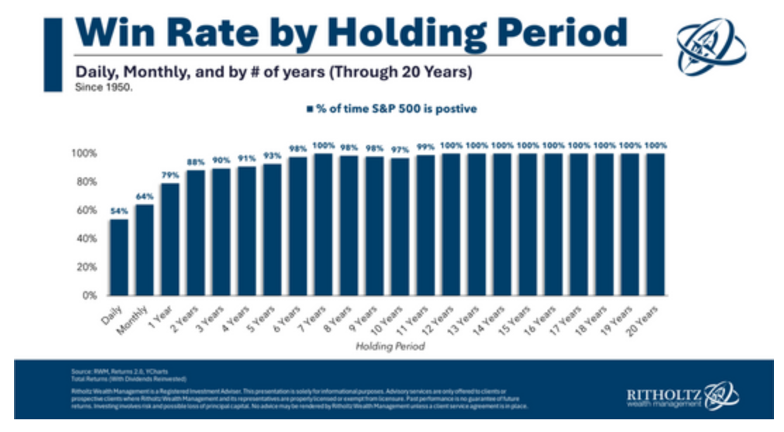 The summer months tend to bring lighter trading volume to the markets. This can exacerbate volatility to both the upside and the downside. We also know that presidential election years tend to bring more volatility from the mid-summer political conventions until mid-October, just before the elections. While we would not be surprised to see a pickup in volatility over the next few months, we would not suggest making changes to your asset allocation strategy, unless your goals have changed. As you can see from the chart below, the market favors those who stay invested over long periods of time.