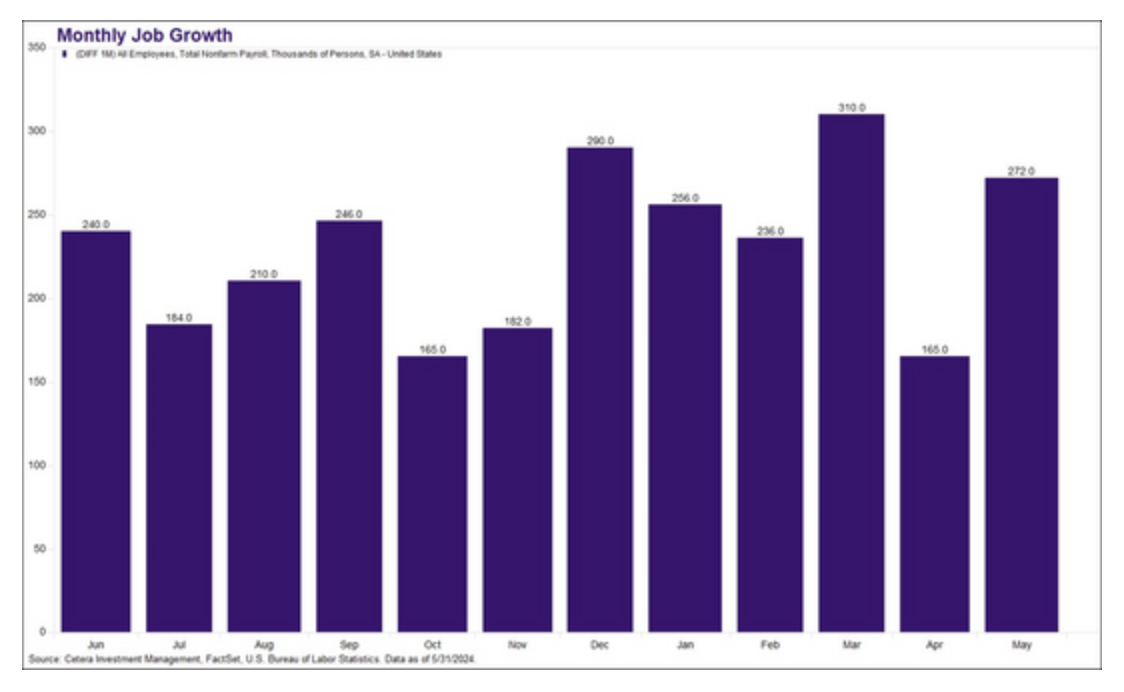 - The market advance was largely due to corporate earnings growth exceeding expectations for the first quarter. Markets moved up despite continuing inflation pressures, which have diminished the probability of the Fed cutting rates in the near term.